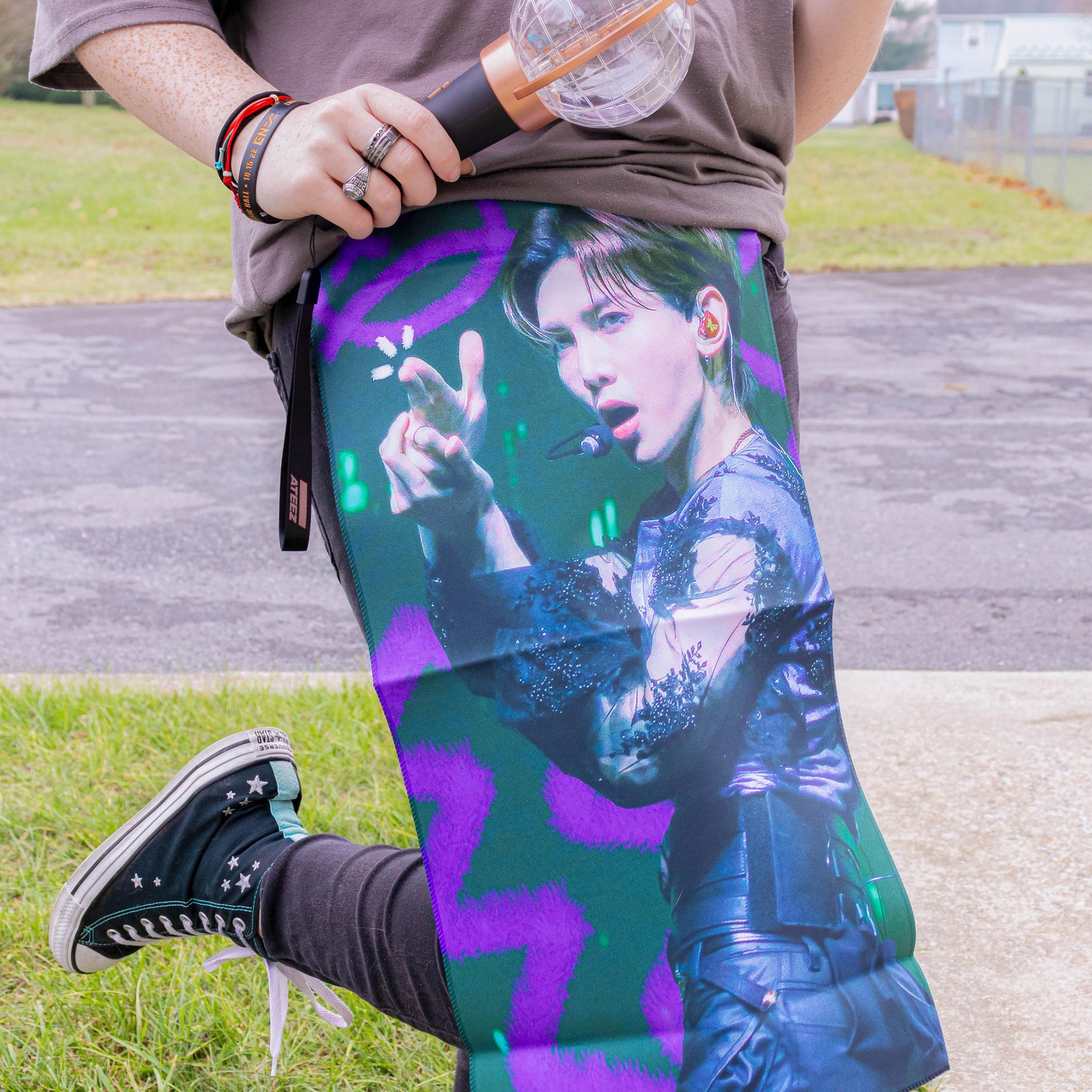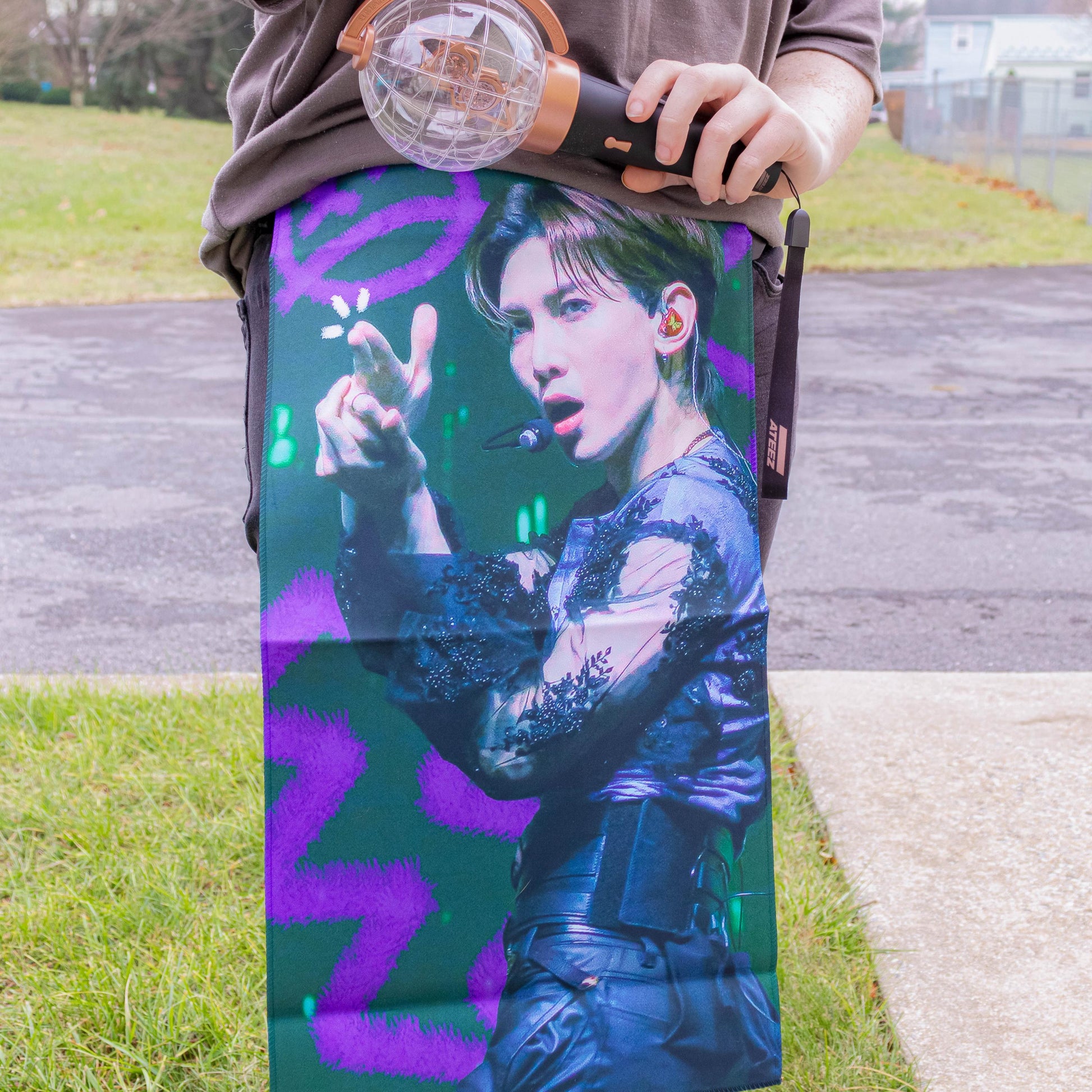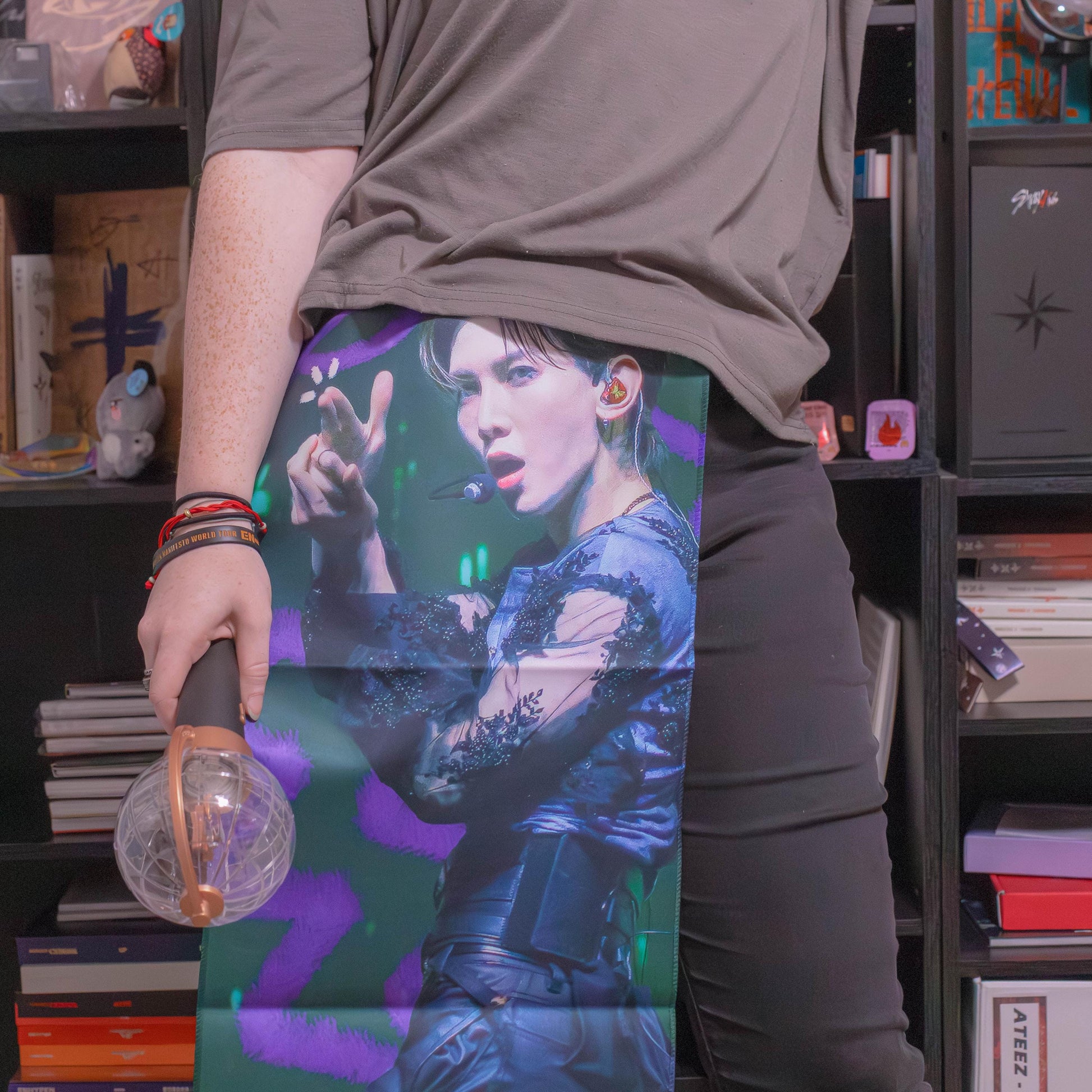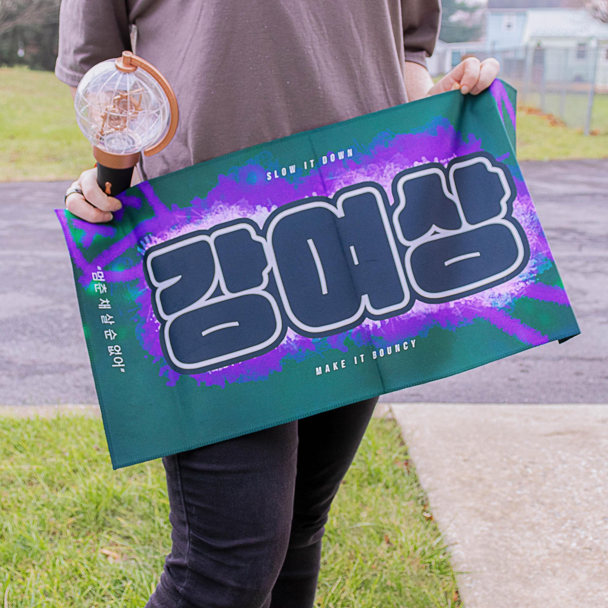 🎶Slow it Down, Make it Bouncy 🌶🎶 with this picture of Yeosang during his iconic line "멈춘 채 살 순 없어 (Can't live life standing still)". This slogan is designed entirely by me, including the picture of Yeosang on the front of the slogan. Show your support for Yeosang by representing this cool slogan at future concerts.