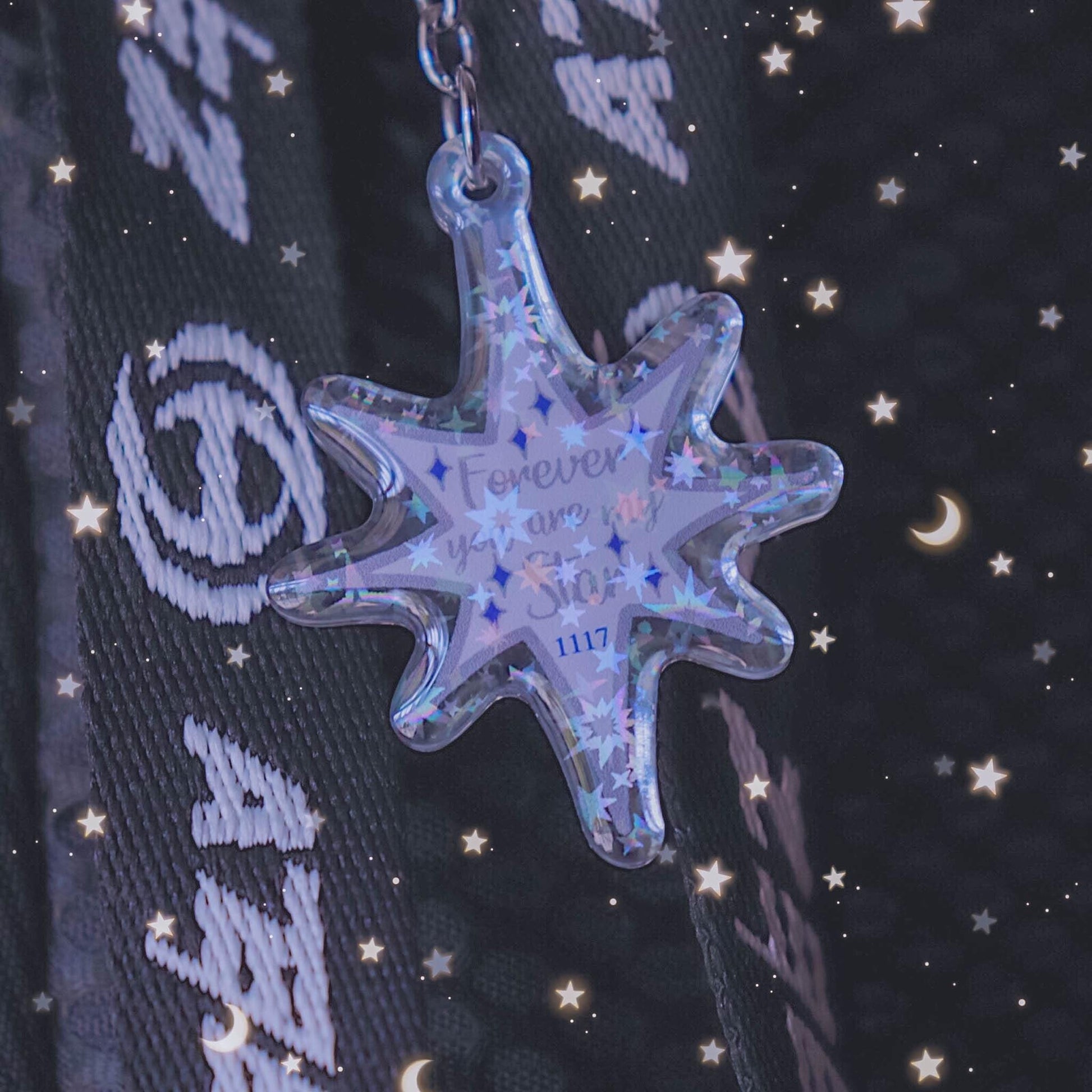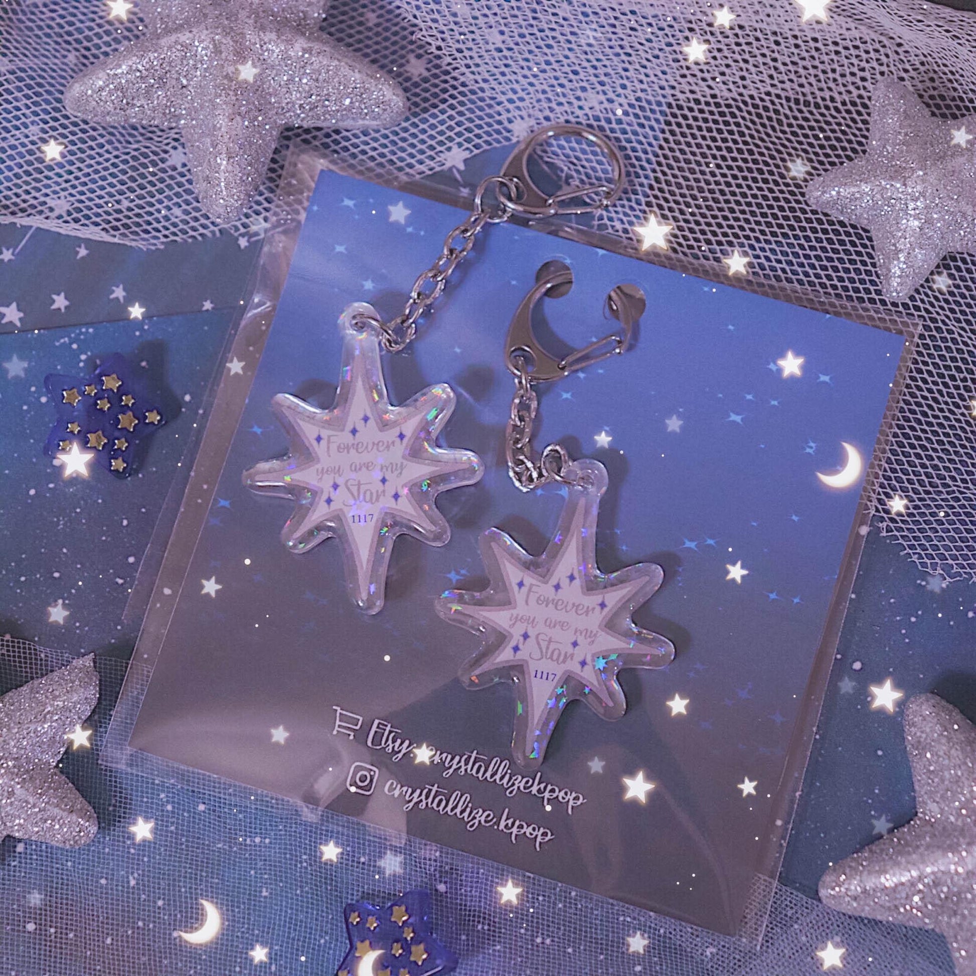 This beautiful acrylic keychain is based off the song Star 1117 by Ateez! This design has a lot of meaning to Atiny as it is the date that our fandom name was chosen. Perfect for decorating your bag with subtle Ateez merch. This design is part of a series with varying products featuring this simple star design with the lyrics of the song and 8 blue stars to represent Ateez. This keychain would be great for Star 1117 lovers, Ateez enthusiasts, Ateez collectors, or anyone a fan of Ateez!